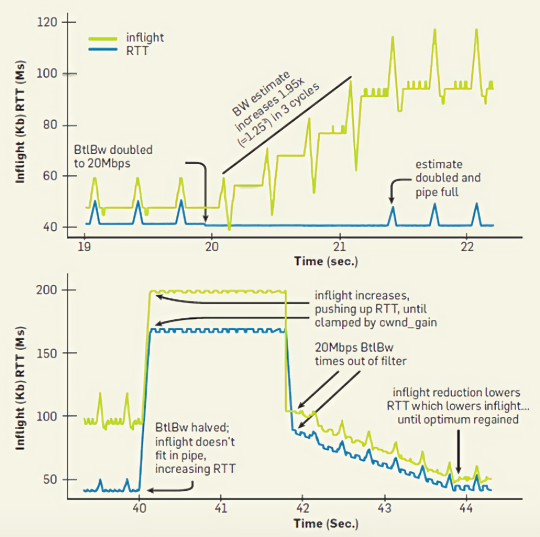 The upper part of the following figure shows the process of bandwidth increasing from 10Mbps to 20Mbps, and the lower part shows the process of bandwidth decreasing from 20Mbps to 10Mbps. At around 20 seconds, the bandwidth on the link suddenly increases, then the RTT has a slight drop, followed by a sharp drop in the number of inflight packets. At this point, BBR detects that the bandwidth has increased, so it correspondingly increases the sending rate. In the next three cycles, the number of inflight packets continues to rise, while the RTT remains unchanged, until the first small peak appears. At this point, the BBR algorithm detects that the pipeline has reached saturation, so it stops further increasing the sending rate.