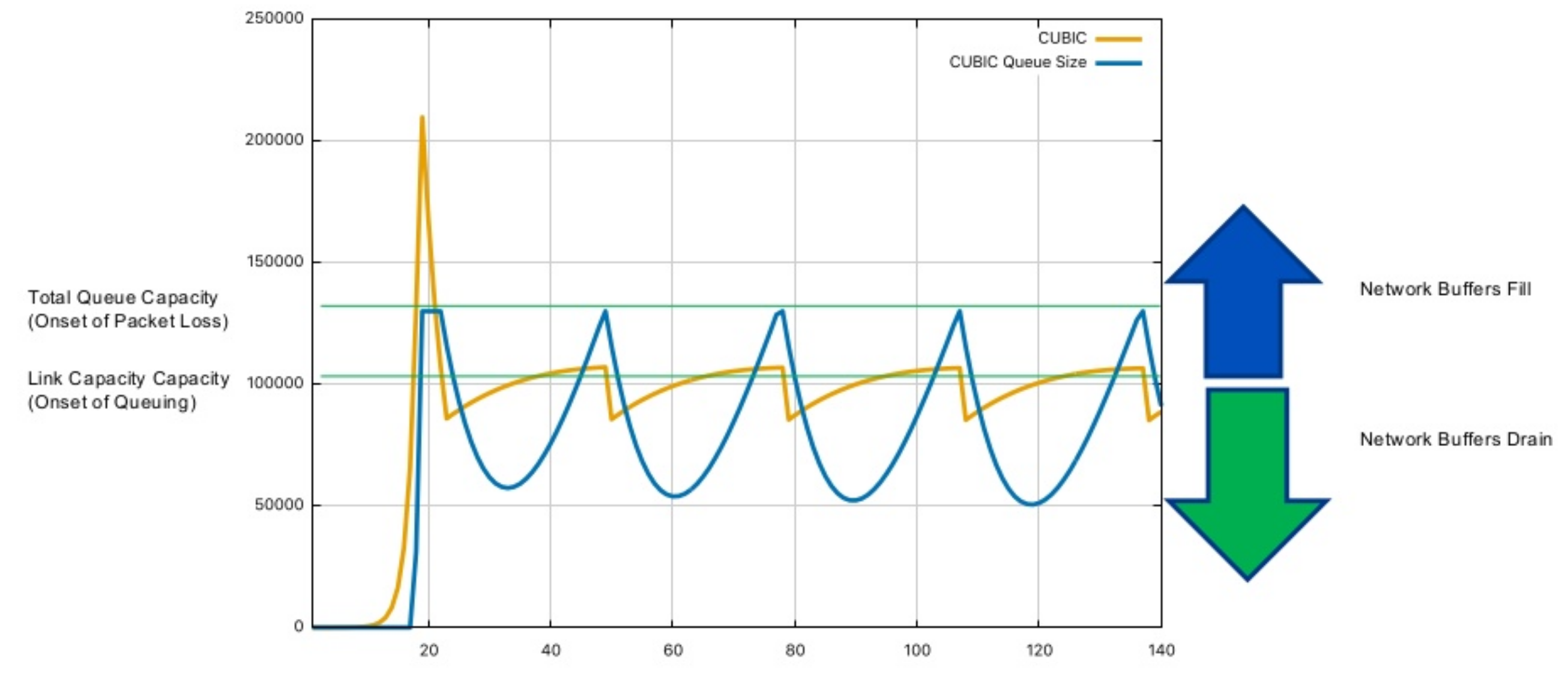 In the above graph, the yellow line represents the size of the congestion window, the blue line represents the number of packets in the buffer queue, and the graph contains two light green horizontal lines. The lower one represents the link pipeline capacity, and the higher one represents the total capacity of the link. At the beginning, the yellow line starts to grow, but does not exceed the lower green line. At this time, no accumulation occurs in the buffer queue, so the blue line remains zero. When the yellow line crosses the lower green line, it indicates that the link pipeline is full, and the packets that arrive later will be placed in the buffer queue. At this time, the blue line will start to grow rapidly until it reaches the higher green line, indicating that the buffer queue is full, and the packets that arrive later will be discarded.