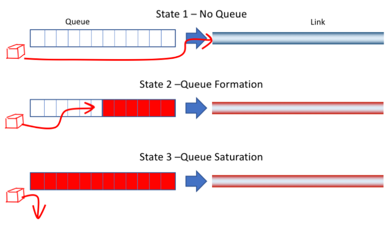 In traditional loss-based algorithms, packet loss is assumed to correspond to network congestion by default. However, with the development of high-speed networks, this correspondence may not be reliable. As introduced earlier, as the congestion window increases, the packet loss rate will inevitably rise. Therefore, we cannot solely rely on packet loss as the only basis for judging network congestion. To better utilize network bandwidth, we first need to understand where the real network bottleneck is. The following diagram illustrates the BBR algorithm’s explanation of network bandwidth limitations at different stages.